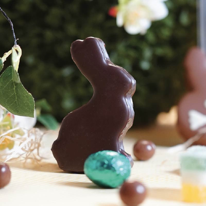 Silhouette élégante, allure gourmande… voici nos lièvres de Pâques en guimauve enrobée de chocolat noir, accompagnés de deux adorables lapins gommes acidulés pomme citron